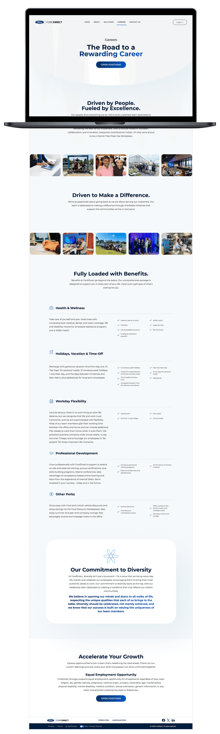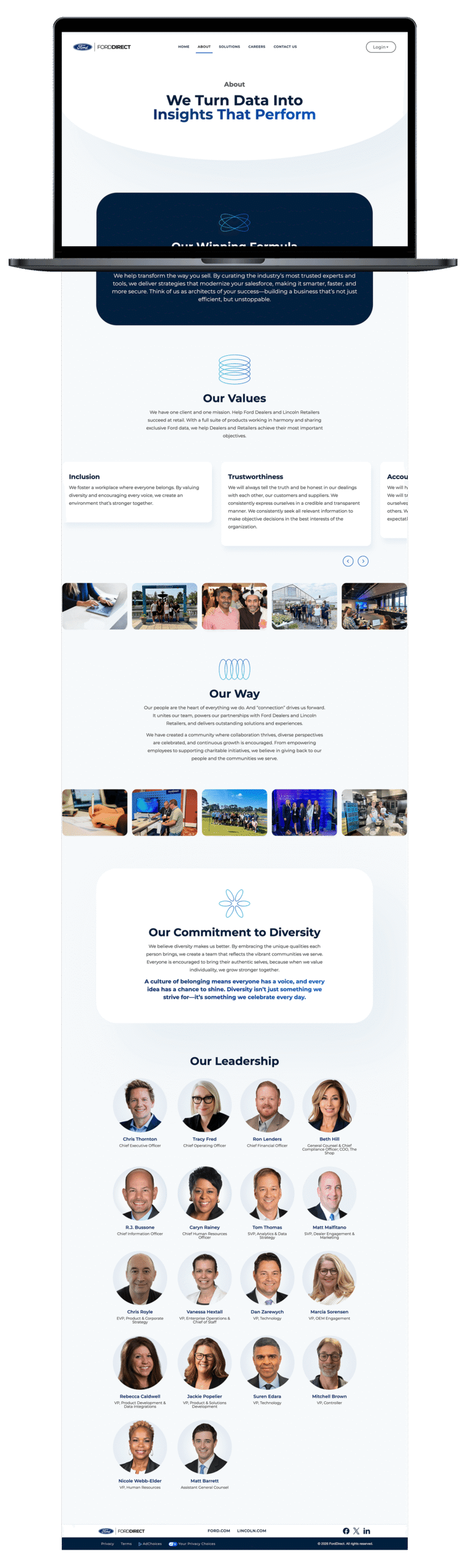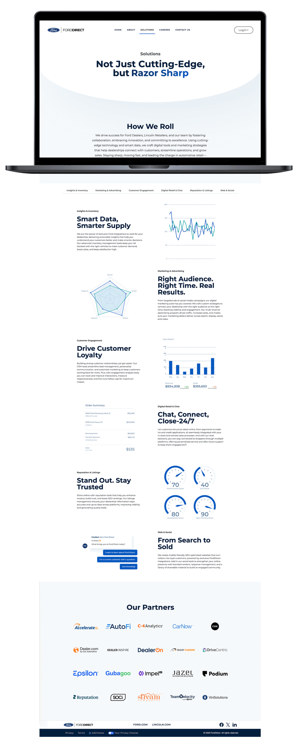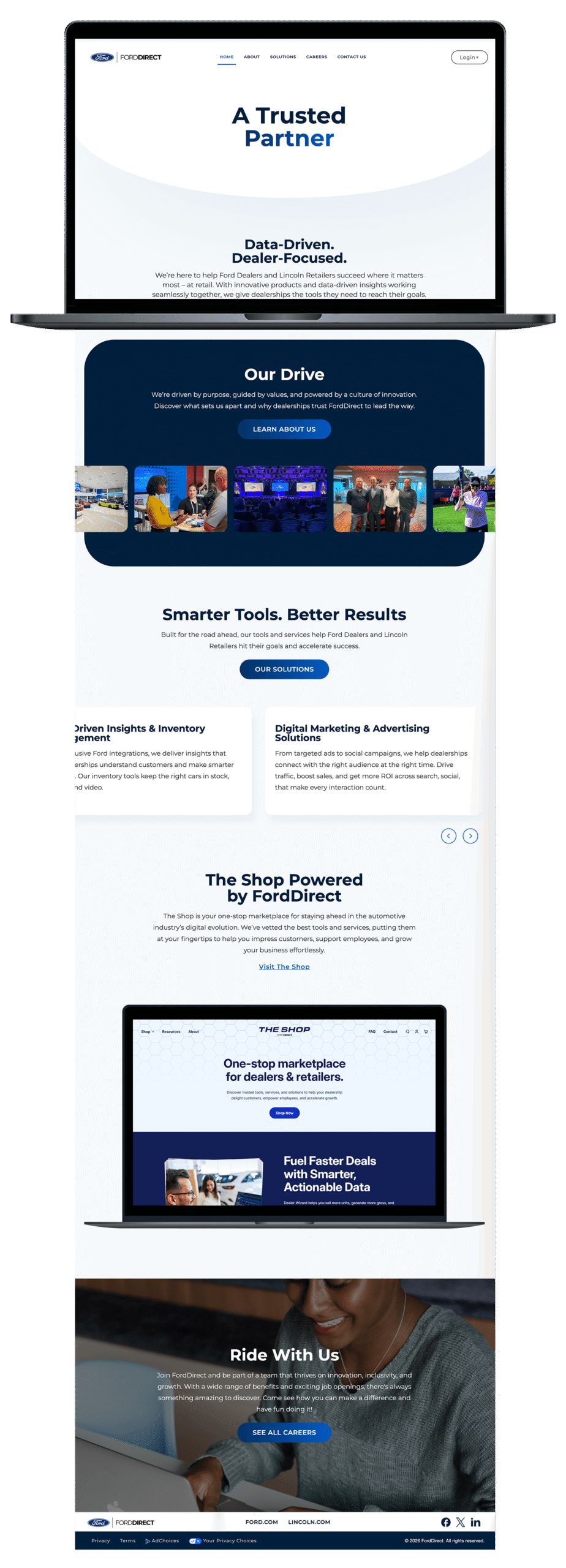 FordDirect offers many products that help assist Ford and Lincoln dealers nation wide. Their previous website, although functional, did not give off the look and feel of an advanced digital company. I was in charge of leading the development of their new site. I coded all HTML and CSS styling as well as prioritized tasks for the development team.